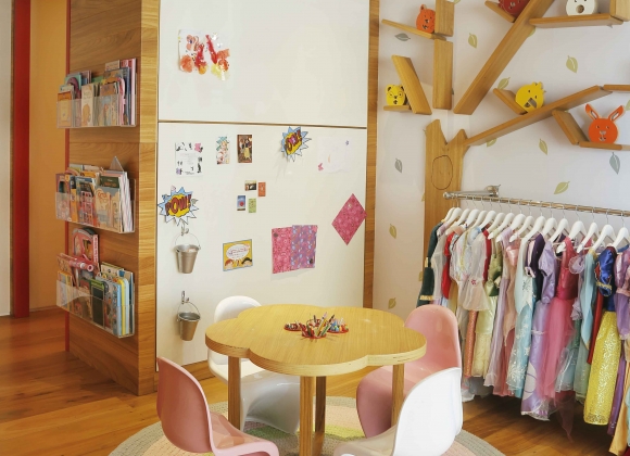 Violeta, a mais nova, agora tem um quarto com bastante espaço para brincar, desenhar e se divertir. O painel verde é louça e ainda tem uma bobina para desenhar. Os livros ficam todos à mão em nichos de acrílico e numa grande estante. A mesinha flor completa o ambiente.