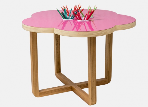 Violeta, a mais nova, agora tem um quarto com bastante espaço para brincar, desenhar e se divertir. O painel verde é louça e ainda tem uma bobina para desenhar. Os livros ficam todos à mão em nichos de acrílico e numa grande estante. A mesinha flor completa o ambiente.