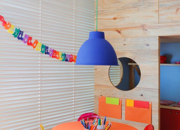 Um tablado do tamanho da parede serve de apoio para o colchão e como espaço para brincar e relaxar. Nichos coloridos, prateleiras em U e revisteiros acomodam brinquedos e livros, tudo no seu lugar. A mesa botão é um espaço ótimo para colorir, brincar de massinha e o que mais a imaginação mandar.