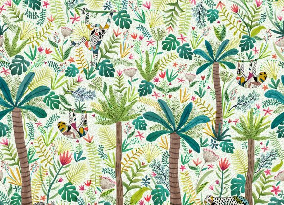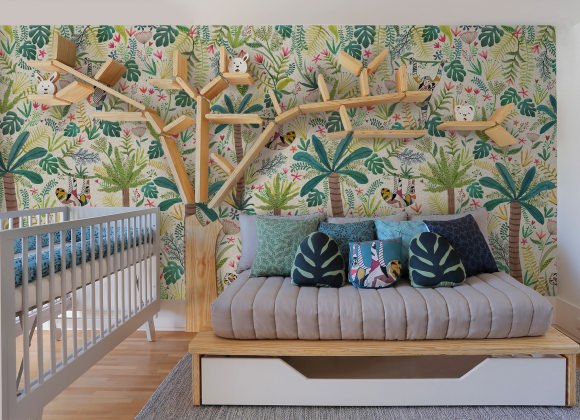 O quarto acabou marcando, em grande estilo, o lançamento do papel de parede Floresta, com os bichos brasileiros da nossa mata, e ainda da Linha Pinus, com móveis feitos da madeira clarinha – tudo da Oba!. Preguiça, onça, tatu e macaco aparecem estampados, misturados a árvores e folhagens – lindo! E na mesma parede, a famosa estante Árvore, agora em pinus.